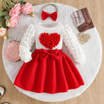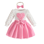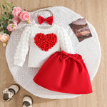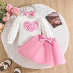 Girls Bubble Sleeve Heart Top Bowknot Short Skirt Hairband Three-piece Set Soft Polyester Fabric Long Sleeve For Spring Autumn