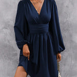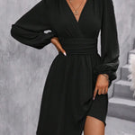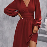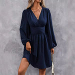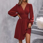 Autumn Winter New Style Gored Lantern Sleeve Pleated Waist Dress Elegant Commute Pure Color V Neck Basic Long Sleeve A Line Dress