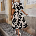 Elegant Floral Print Split Dress For Women Cross Neck Belt Wide Hem Short Sleeve Summer New Style Commute Quality Polyester