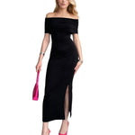 High Waist Slit One Shoulder Dress European Style Summer Long Dress Ladies Fashion Short Sleeve Bodycon Dress Pure Color