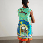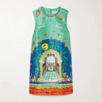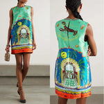 Summer Round Neck Graffiti Print Satin Short Skirt Dress Style Floral Pattern No Sleeve Princess Style