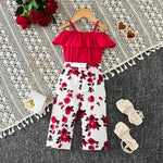 Summer Children's Clothing Floral Patterned Romper And Pants Set For Girls With Strap Tops And Long Pants Two-Piece Polyester Suit