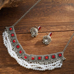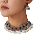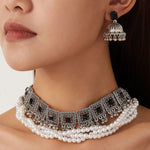 Elegant Pearl Necklace Earring Set Vintage Tassel Bell Charm Alloy Metal Geometric Design Quadrate Diamond Women Jewelry
