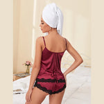 Sexy Lace Patchwork Silk Home Clothes Set Shoulder Bared Strap Back Tie Design Women's Sleepwear Comfortable Polyester Blend