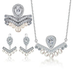 Elegant Pure Silver Jewelry Set For Women Crown Ring Tassel Pearl Earrings Luxury V-Neck Necklace Style