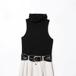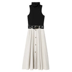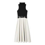 Fashionable Color Block Waist Belt Dress Elegant No Sleeve Polyester Fabric Half High Collar Dress Stylish Splicing Skirt