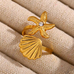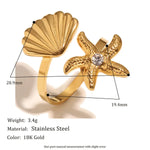 Pattern: Starfish,Shell Plating Material: 18K Gold Plated Inlay Material: Zircon Design: Plating,Inlay Quantity: 1 Piece Occasion: Holiday,Daily,Beach Material: 304 Stainless Steel Classification: Rings Style: Vacation,Beach Season: All Seasons Gender: Women's Weight: 8g