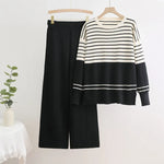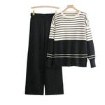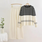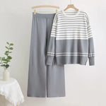 Autumn Winter Striped Knitted Two-Piece Set Round Neck Casual Loose Fashion Ensemble Women's Long Sleeve Long Pants Comfortable