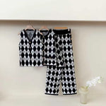 Fashionable Knitted Plaid Letter Embroidery Vest Long Sleeve Open Cardigan Wide Leg Pants Three Piece Set Elegant Commute Style