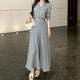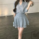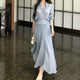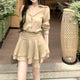 Khaki Retro V-Neck Long Sleeve Shirt Women Summer Casual Set High Waist A-Line Skirt Half-length Two-Piece Set Fashionable