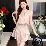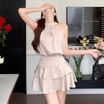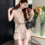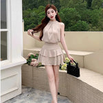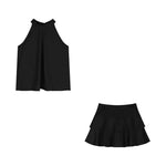 Summer Casual Two-Piece Set Women's Sleeveless Neck Hanging Vest Top With Ruffle Hem Short Skirt High-Quality Polyester Fabric