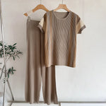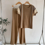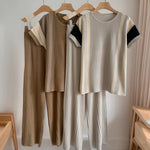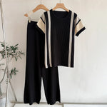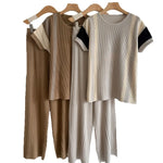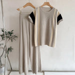 Casual Knitted T-Shirt And Wide Leg Pants Set Color Block Pleated Fashion Leisure Outfit Women's Business Commute Style