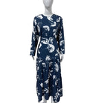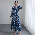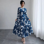 Elegant Blue Long Sleeve Round Neck Dress French Style Printed Waist Cinched Slimming Midi Skirt Plant Floral Polyester Dress