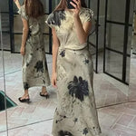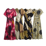 Elegant Floral Print Silk Satin Midi Dress Women's Spring New Style Fashionable Gathered Waist European Style Dress