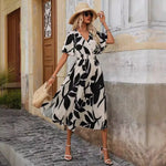 Elegant Floral Print Split Dress For Women Cross Neck Belt Wide Hem Short Sleeve Summer New Style Commute Quality Polyester