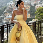 Pattern: Solid Color Color: Yellow,Black Occasion: Daily Fabric Type: Polyester Neckline: Strapless Sleeve Length: Sleeveless Sleeve Type: Sleeveless Style: Simple Style Season: Summer Fit Type: Regular Fit Dresses Type: Slit Dress Gender: Women's Weight: 611g...