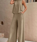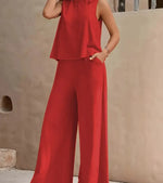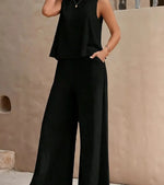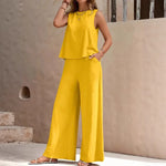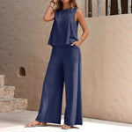 Elegant Pure Color Two-Piece Set With Round Neck Vest And Wide Leg Pants Organic Cotton And Polyester Blend Casual Women's Outfit