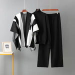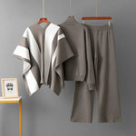 New Color Block French Style Knitted Set Shawl Round Neck Loose Wide Leg Pants Three Piece Women Casual Fashion Outfit