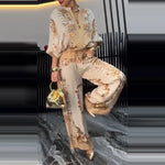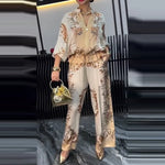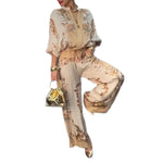 Pattern: Plant Color: Khaki Occasion: Holiday,Daily Fabric Type: Polyester Top Length: Long Fit Type: Regular Fit Tops Type: Blouse Gender: Women's Placket Type: Zipper Quantity: 2 Pieces Set Sets Type: Pant Co-ord Set Neckline: V...