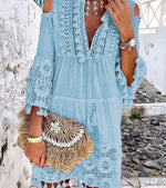 women's boho dress ethnic style v neck tassel hollow out 3/4 length sleeve solid color above knee travel