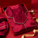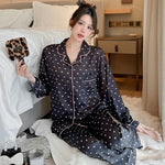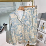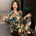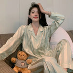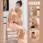 Pure Color Lace Splice Smooth Ice Silk Sleepwear Set Women Long Sleeve Long Pants Two Piece Set High-End Sensation Home Clothes