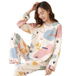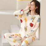 Women's Cotton-Like Long Sleeve Round Neck Sleepwear Set Spring Autumn Cartoon Home Clothes Warm Elastic Polyester Silk