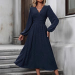 Autumn Winter New Style Midi Dress With Pleated Waist Lantern Sleeve Diagonal Collar Pure Color V-neck Elegant Commute Dress