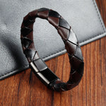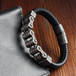 Handmade Stainless Steel Men's Double Layer Leather Cord Bracelet Woven Fashionable Geometric Pattern Polished Round Style
