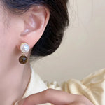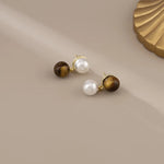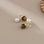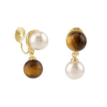 Retro Asymmetric Tiger Eye Stone Pearl Earrings Women Simple Personality Elegant Luxury Mosquito Coil Tray Clip-On Earrings No Piercing Required